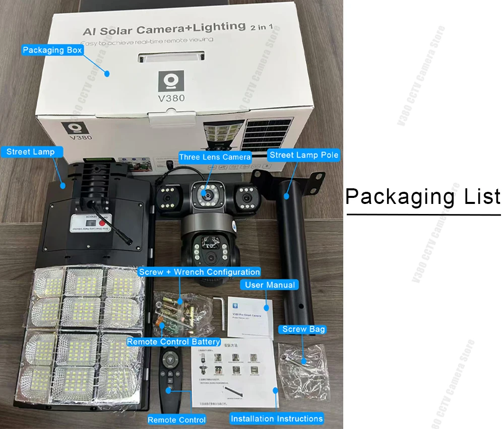 Packaging box ×1 / Street lamp ×1 / Camera x 1 / Street lamp pole x 1 / Screw + Wrench Configuration x 1/ User manual × 1/ Remote control battery x 1 / Screw bag x 1 / Remote control × 1/ Installation instructions × 1