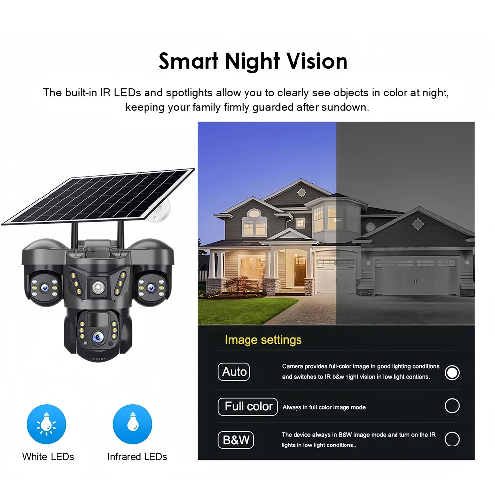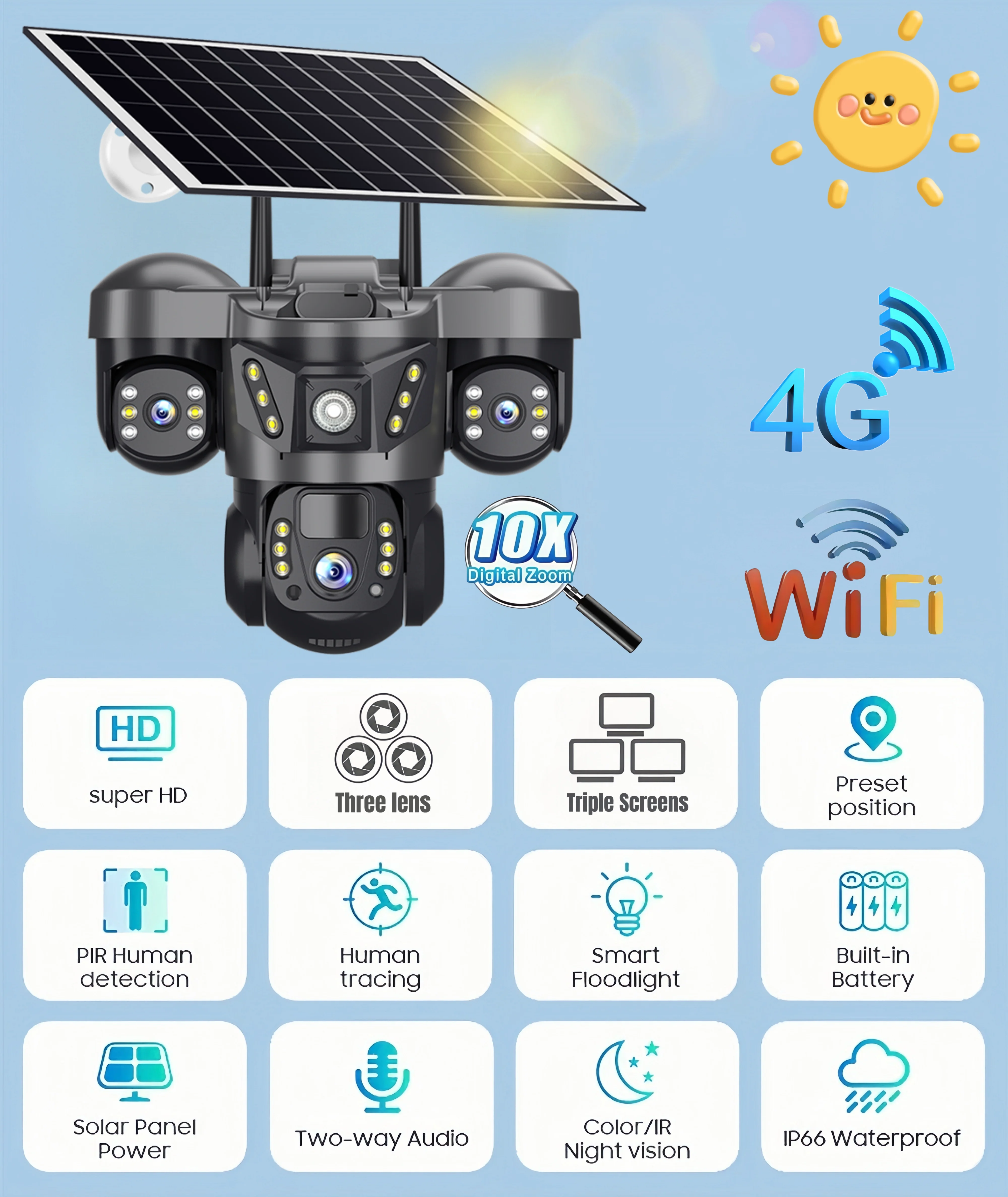 Solar 4G Camera Sim Card 15MP 8K Three Lens Three Screen Monitor Night Vision Security Protection PTZ Video Surveillance