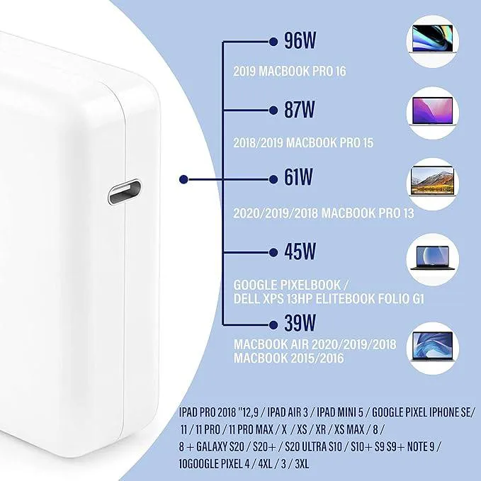 Le chargeur 96W USB-C est un kit d'alimentation complet offrant une recharge rapide et sécurisée pour votre MacBook. Grâce à sa puissance élevée et sa gestion intelligente du courant, il est idéal pour maintenir vos performances créatives sans interruption. Son format compact et son câble Type-C inclus en font l'accessoire de remplacement parfait, certifié pour une stabilité de charge exemplaire.