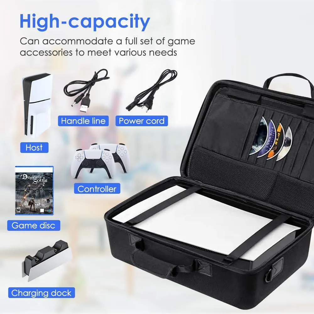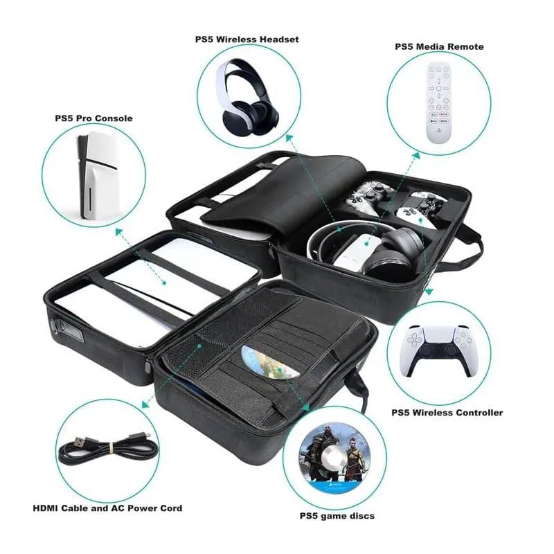 Ce sac de voyage pour PS5 est doté d'une coque rigide (Hard Case) offrant une défense ultime contre les chutes et les écrasements. Il dispose d'un espace de rangement intelligent pour la console, deux manettes DualSense, les câbles et vos jeux préférés. Équipé d'une bandoulière réglable et d'une poignée renforcée, il garantit un transport facile et sécurisé pour toutes vos aventures gaming.