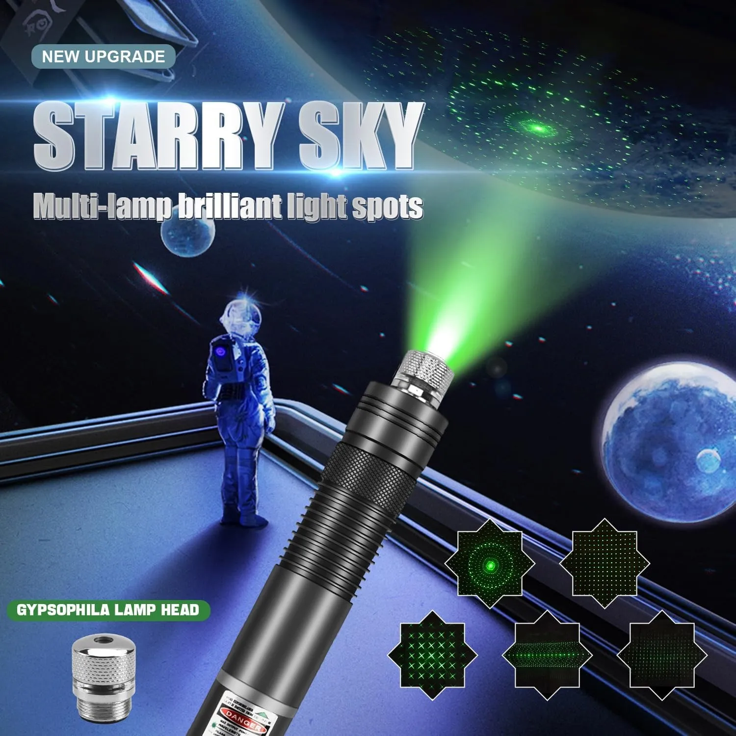 - ?Modes d'éclairage étoilé multiples?Doté de 5 embouts lumineux, ce pointeur laser vous permet, en faisant pivoter l'embout argenté, de créer différents motifs lumineux raffinés adaptés à chaque situation. Laissez-vous émerveiller par la magie d'un ciel étoilé romantique.