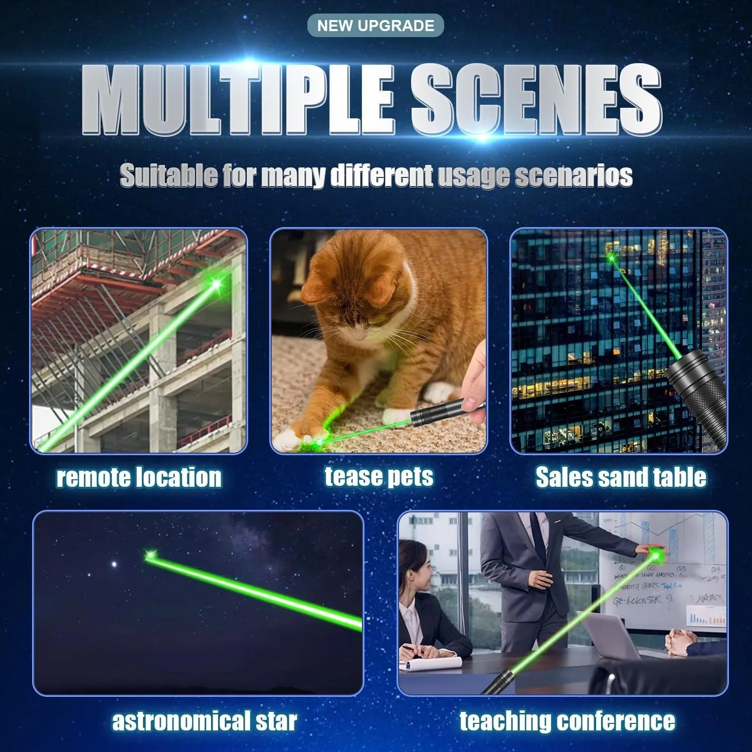 - ?Pointeur laser haute puissance?Tournez et retirez le capuchon en forme d'étoile pour profiter d'un faisceau laser longue portée. De jour comme de nuit, vous pouvez suivre clairement la trajectoire du faisceau laser vert. Ce pointeur laser haute puissance peut atteindre une distance de 6 000 mètres (20 000 pieds) la nuit.