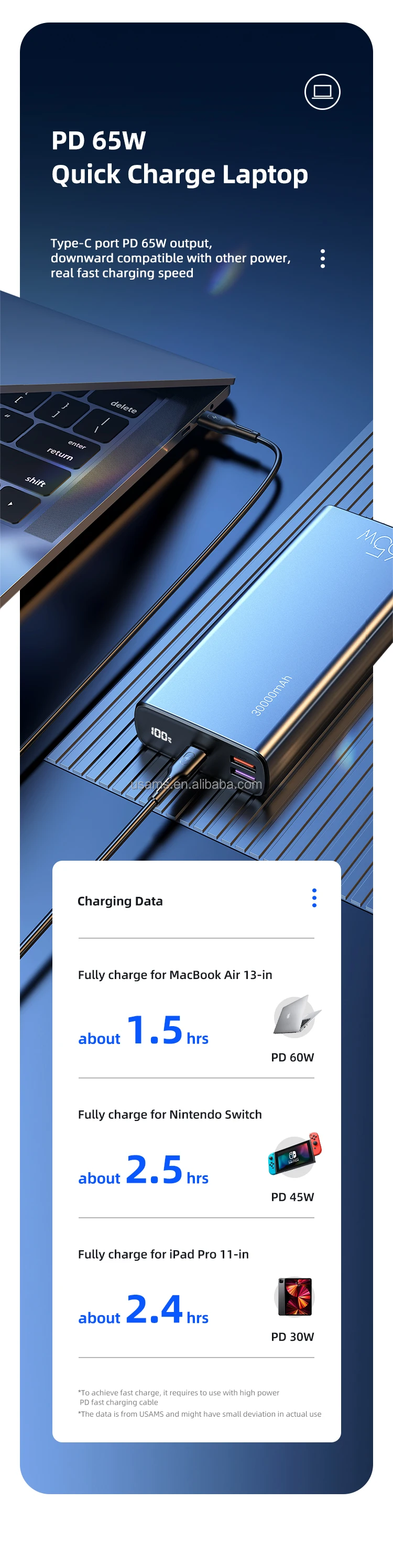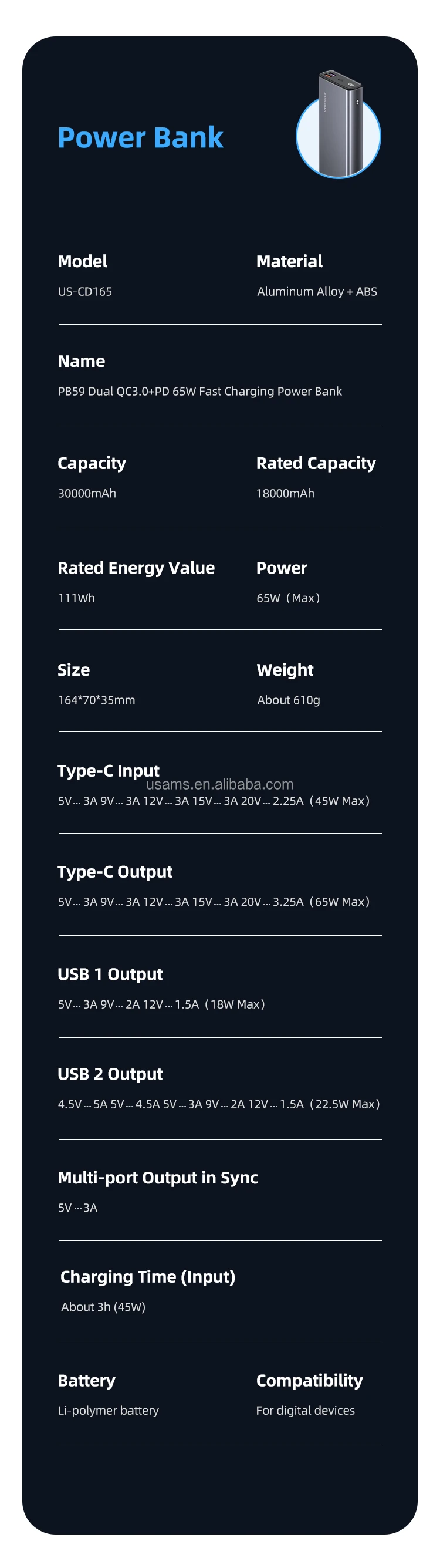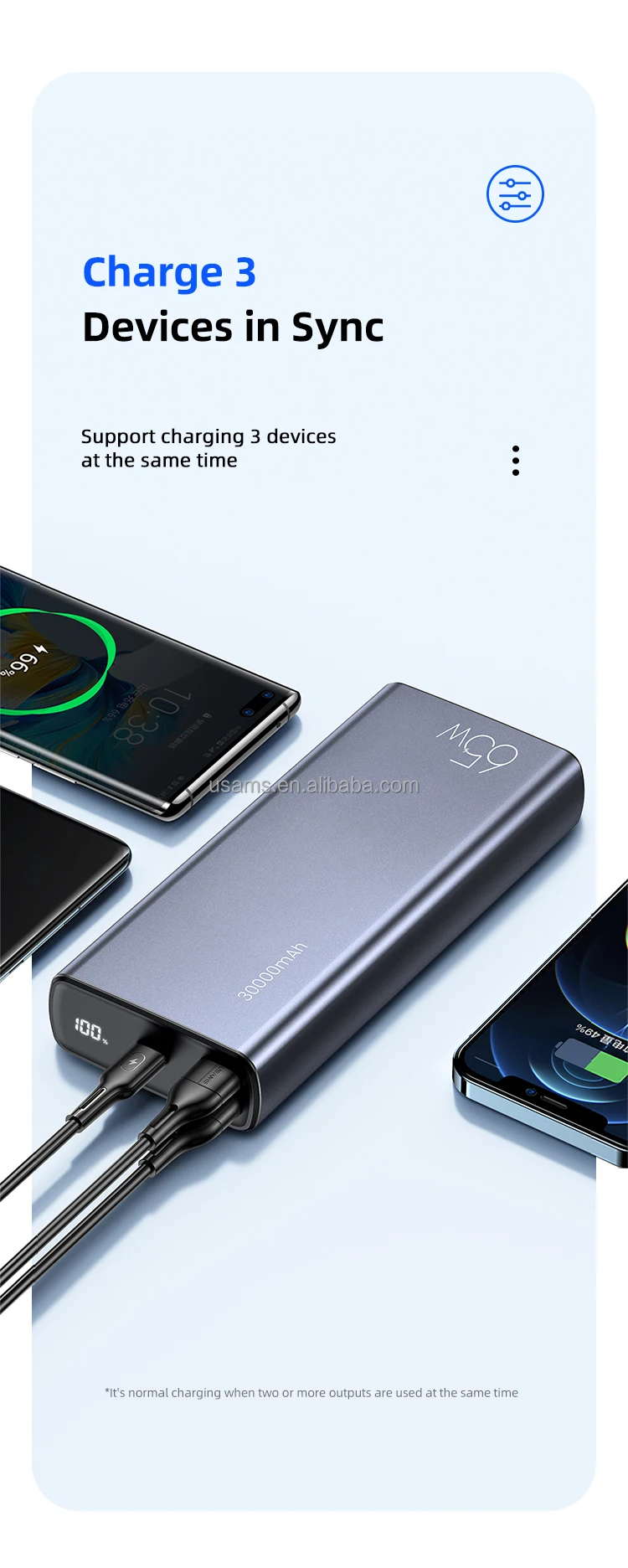 | Puissance | Production totale | 65W (Max) | Capable de charger un ordinateur portable. |