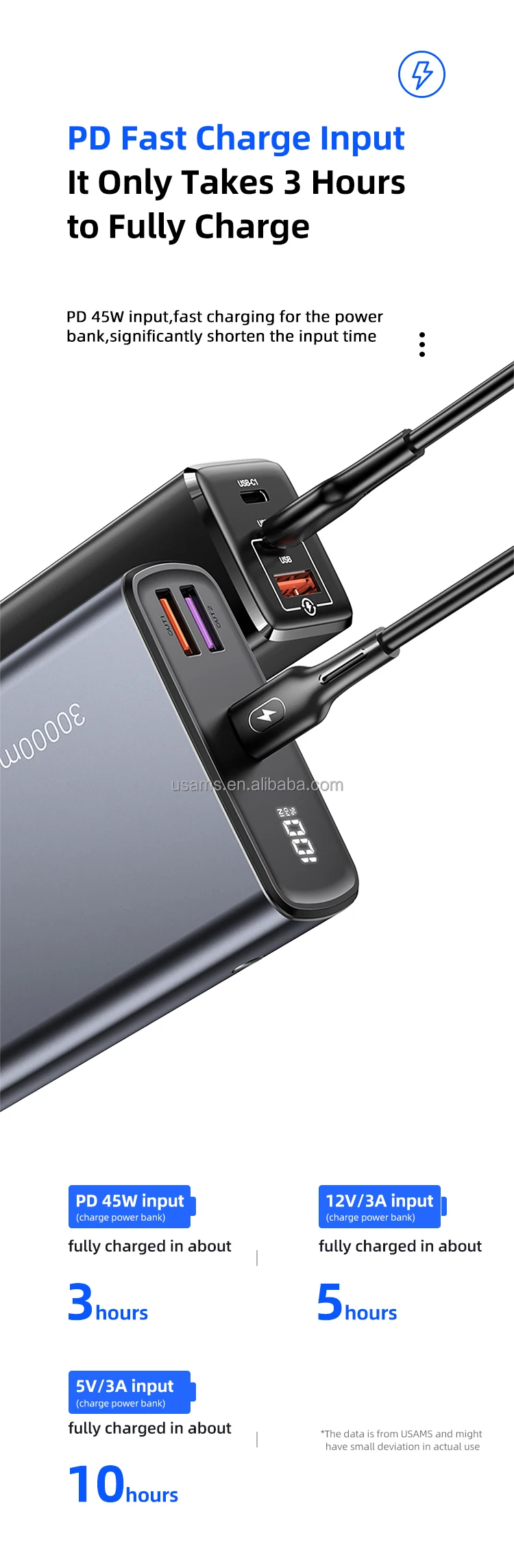 | Connectique | Câbles intégrés | Type-C, Lightning, Micro | Avec câbles pour une utilisation sans encombre. |