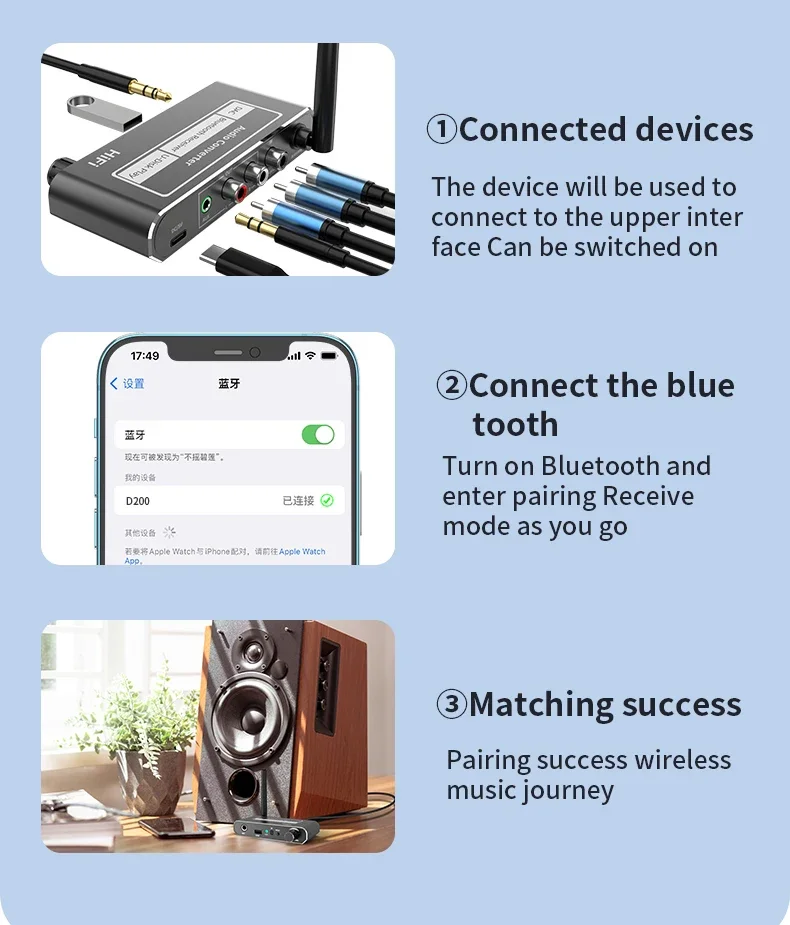 (The function of the Bluetooth receiver is to add Bluetooth wireless function to the wired speaker/headphone, so that the Bluetooth-enabled device such as the mobile phone can be wirelessly connected to the wired speaker/headphone through the adapter.)
