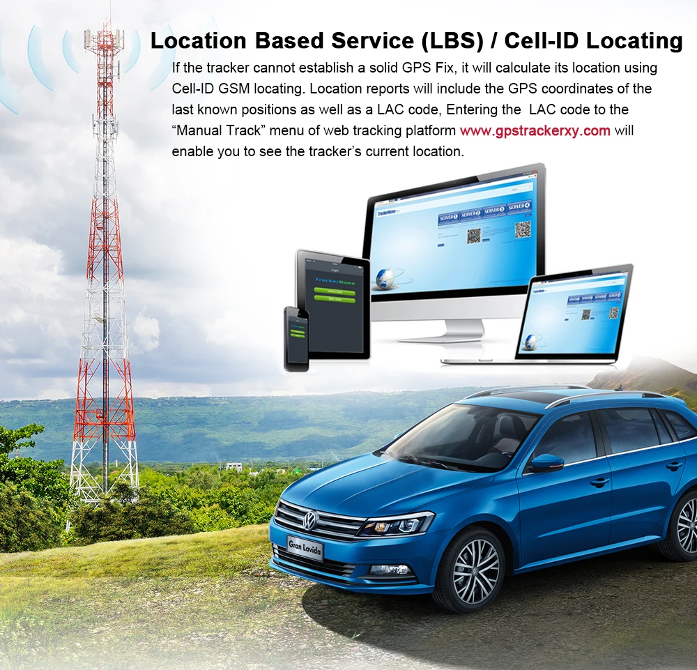 7. Service basé sur la localisation (LBS) /localisation de l'ID cellulaire: Si le traceur ne peut pas établir une correction GPS solide, il calculera son emplacement en utilisant la localisation GSM Cell-ID. Les rapports de localisation comprendront les coordonnées GPS des dernières positions connues ainsi qu'un code LAC, entrer le code LAC dans le menu «Suivi manuel» de la plate-forme de suivi Web pour m www.gpstrackerxy.com vous permettra de voir l'emplacement actuel du traceur. Vous pouvez également envoyer la commande "adresse + mot de passe" au traqueur pour demander l'adresse exacte, le suivi passera automatiquement au suivi par LBS en mode GPRS. La précision du LBS dépend de la distance à la tour cellulaire réseau GSM ou à la station de base la plus proche.