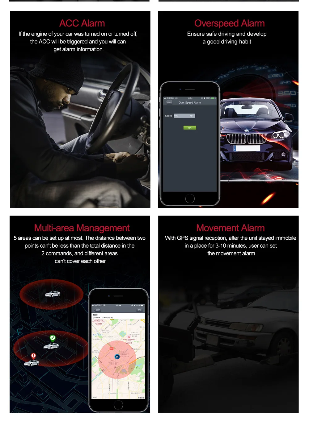 * Alarme ACC: L'unité enverra des SMS "alarme ACC + lat/long" au numéro autorisé à un intervalle de 3 minutes lorsque le moteur de la voiture est allumé, c'est-à-dire que la clé est tournée en position "ACC ON" pour démarrer la voiture à l'état de bras; La sirène retentit pendant 20 secondes, Et répéter à l'intervalle de 20 secondes si l'ACC reste toujours allumé. Désarmer pour arrêter cette alarme.