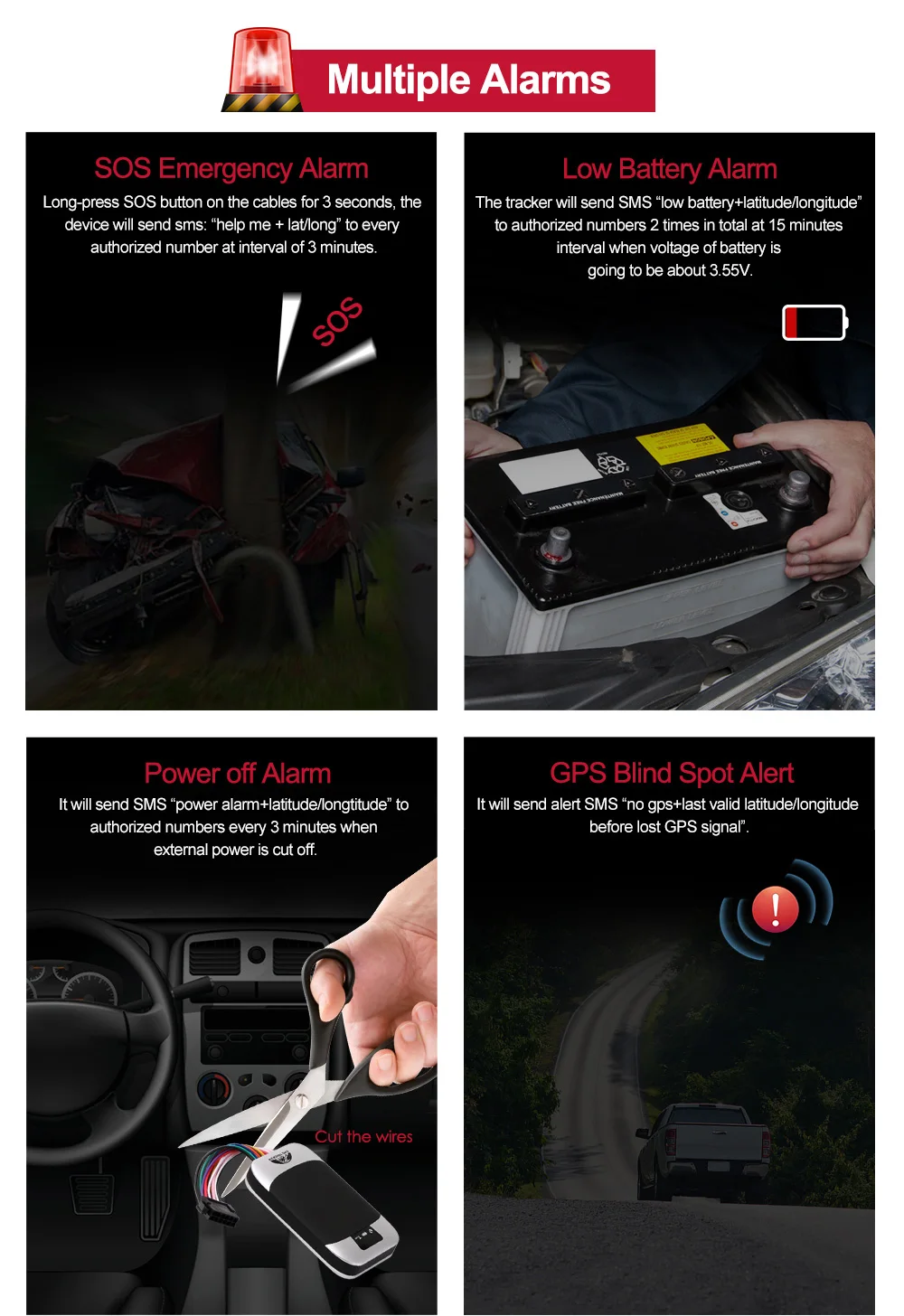 * Alarme de mise hors tension: Il enverra un SMS "alarme d'alimentation + latitude/longtitude" aux numéros autorisés toutes les 3 minutes lorsque l'alimentation externe est coupée.