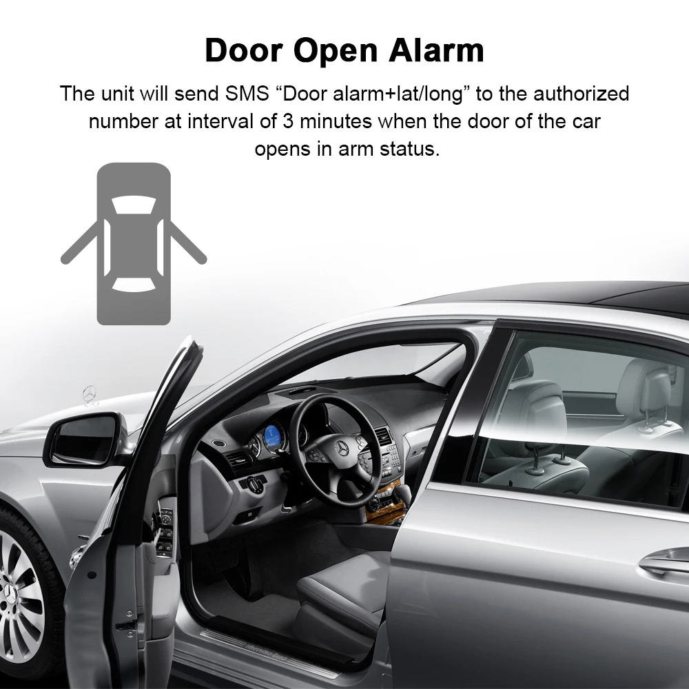* Alarme de porte ouverte: L'unité enverra SMS "Alarme de porte + lat/long" au numéro autorisé à l'intervalle de 3 minutes lorsque la porte de la voiture s'ouvre en état de bras. La sirène retentit pendant 20 secondes et répète le son à un intervalle de 20 secondes minutes si la porte est toujours ouverte. Désarmer pour arrêter cette alarme
