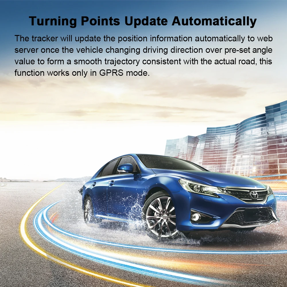 4. Mise à jour automatique des points tournants: Le tracker mettra à jour automatiquement les informations de position sur le serveur Web une fois que le véhicule changera de direction de conduite sur la valeur d'angle prédéfinie pour former une trajectoire lisse cohérente avec la route réelle, cette fonction ne fonctionne qu'en mode GPRS.