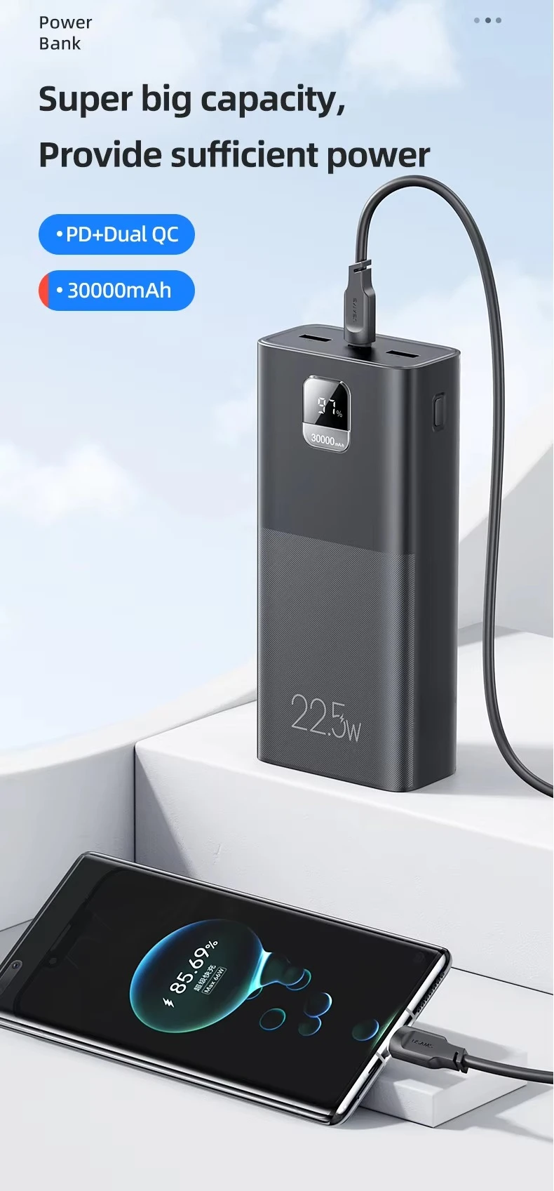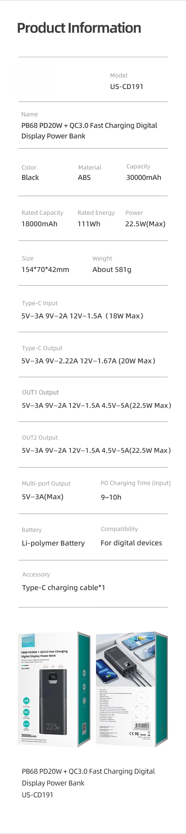 | Énergie | Capacité | 30000mAh | Haute capacité pour plusieurs jours d'usage. |