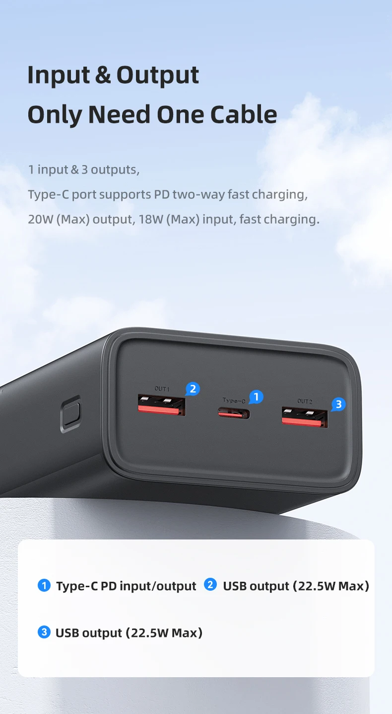 | Sorties | Interface de sortie | Double USB, Type-C (65W) | Charge simultanée de plusieurs appareils. |