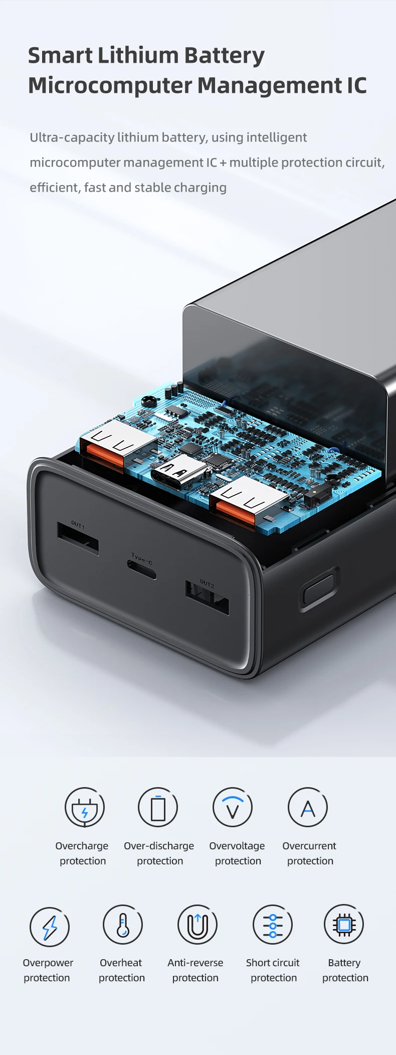 | Protection | Système de sécurité | Surcharge, Court-circuit, Basse tension | Protection contre la décharge excessive. |