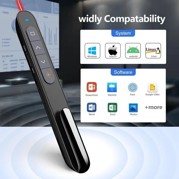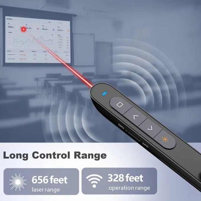 Page précédente / page suivante / volume / lecture des diapositives / plein écran / écran noir / lien hypertexte pour présentation PowerPoint, prend en charge le navigateur de site Web / logiciel d'image pour basculer la page vers le haut et vers le bas. Un pointeur lumineux rouge vif met en évidence les zones clés de vos diapositives.