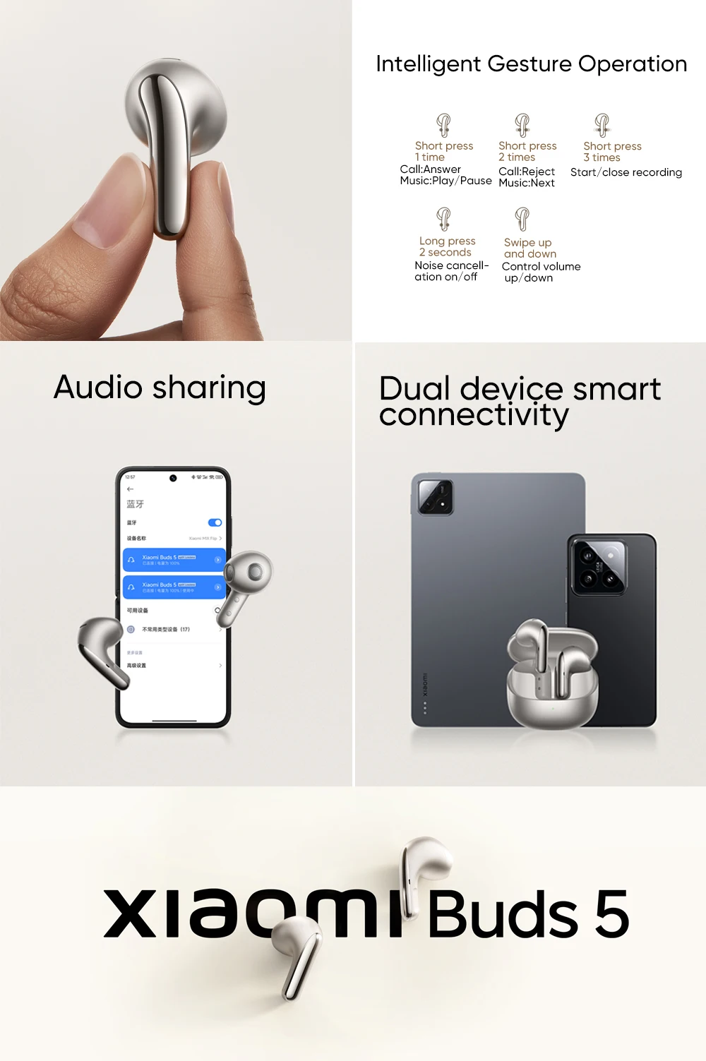 | Contenu de l'emballage | Xiaomi Buds 5 x 1, Charging case x 1, Type-C Charging cable x 1, User manual x1 |